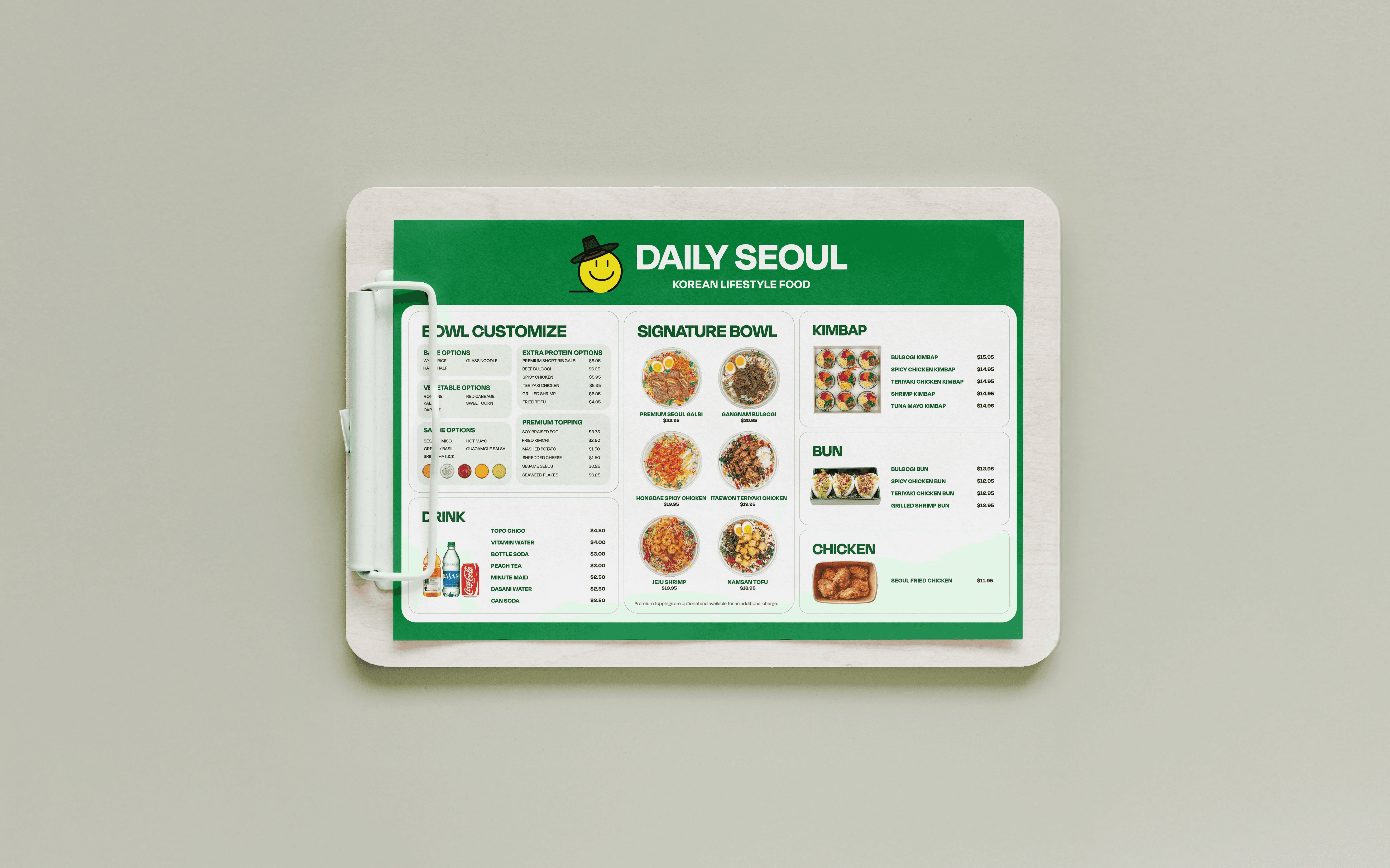 Daily Seoul is a Korean lifestyle food brand designed for H-Mart food courts.